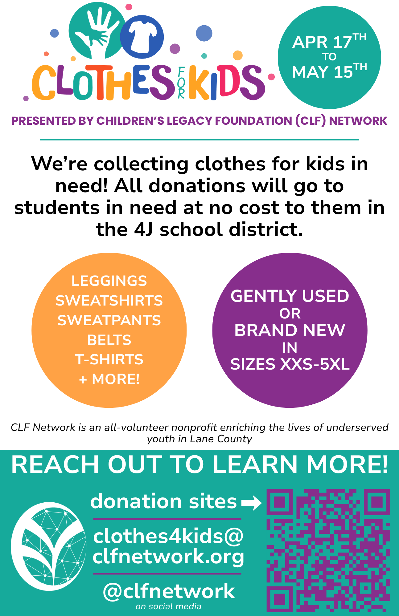 The inaugural year for the Clothes for Kids campaign was in 2024! This project’s goal is to gather clothing donations to be distributed among local high schools in Eugene and Springfield, for students in need to have access to free clothing. Start your spring cleaning with a way to help kids in our community!